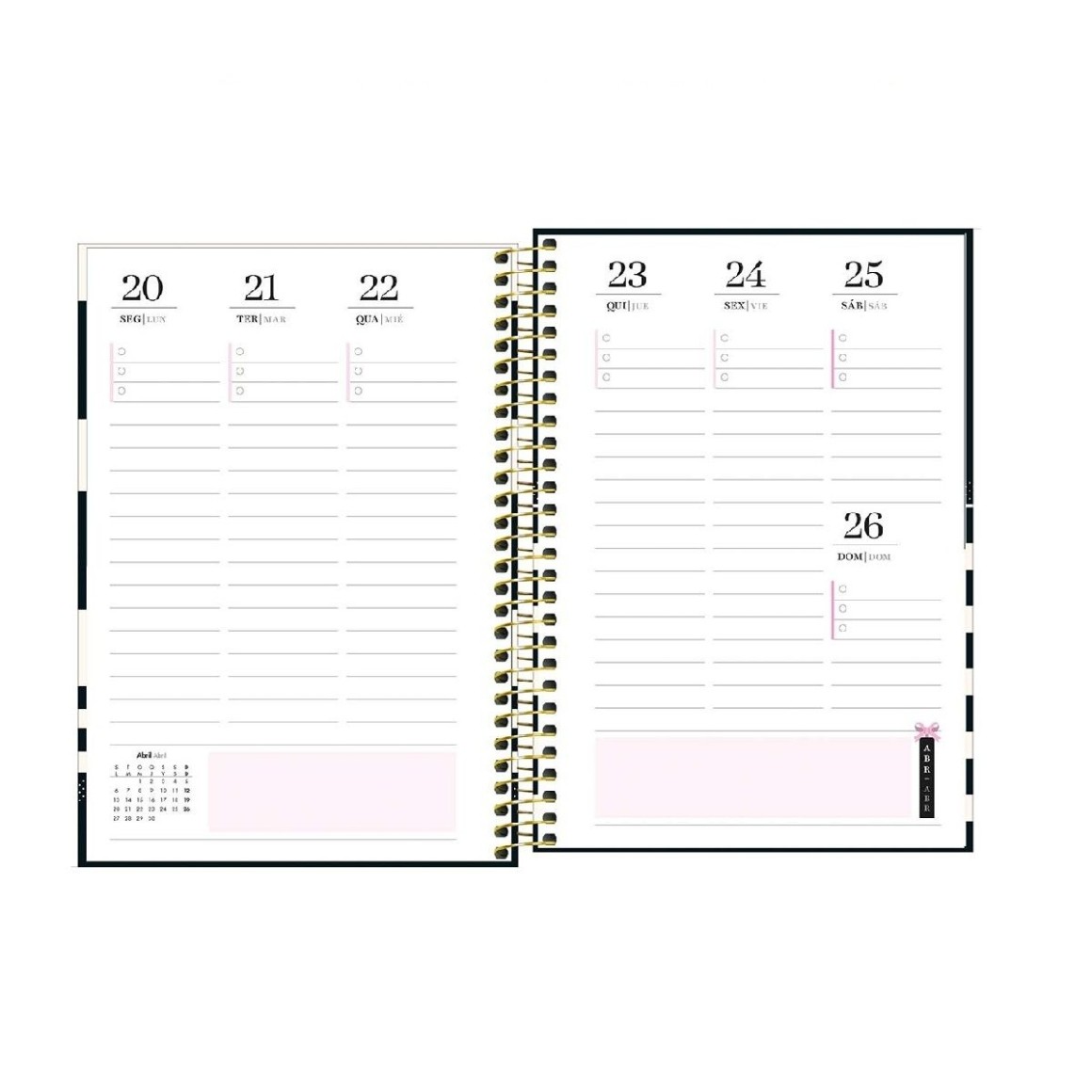 O produto tem capa dura com hot stamping e fechamento em elástico, espiral dourado, 80 folhas, adesivos e bolsa em papel para guardar documentos.
