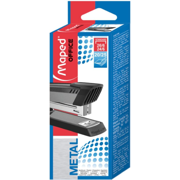 Grampeador Metal 26/6 Até 25 Folhas Maped Office 3927. Duas funções: grampeamento e tacheamento.