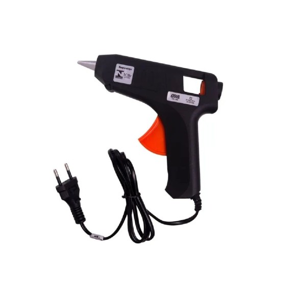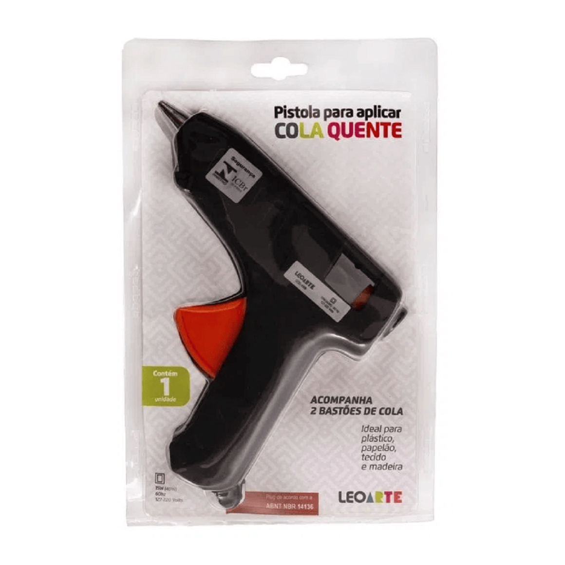 A Pistola Para Aplicar Cola Quente Grande Leoarte é bivolt, potência de pico: 40W e potência estabilizada: 15W, possui cabo de 1m e tem seu aquecimento entre 3 à 5 minutos.