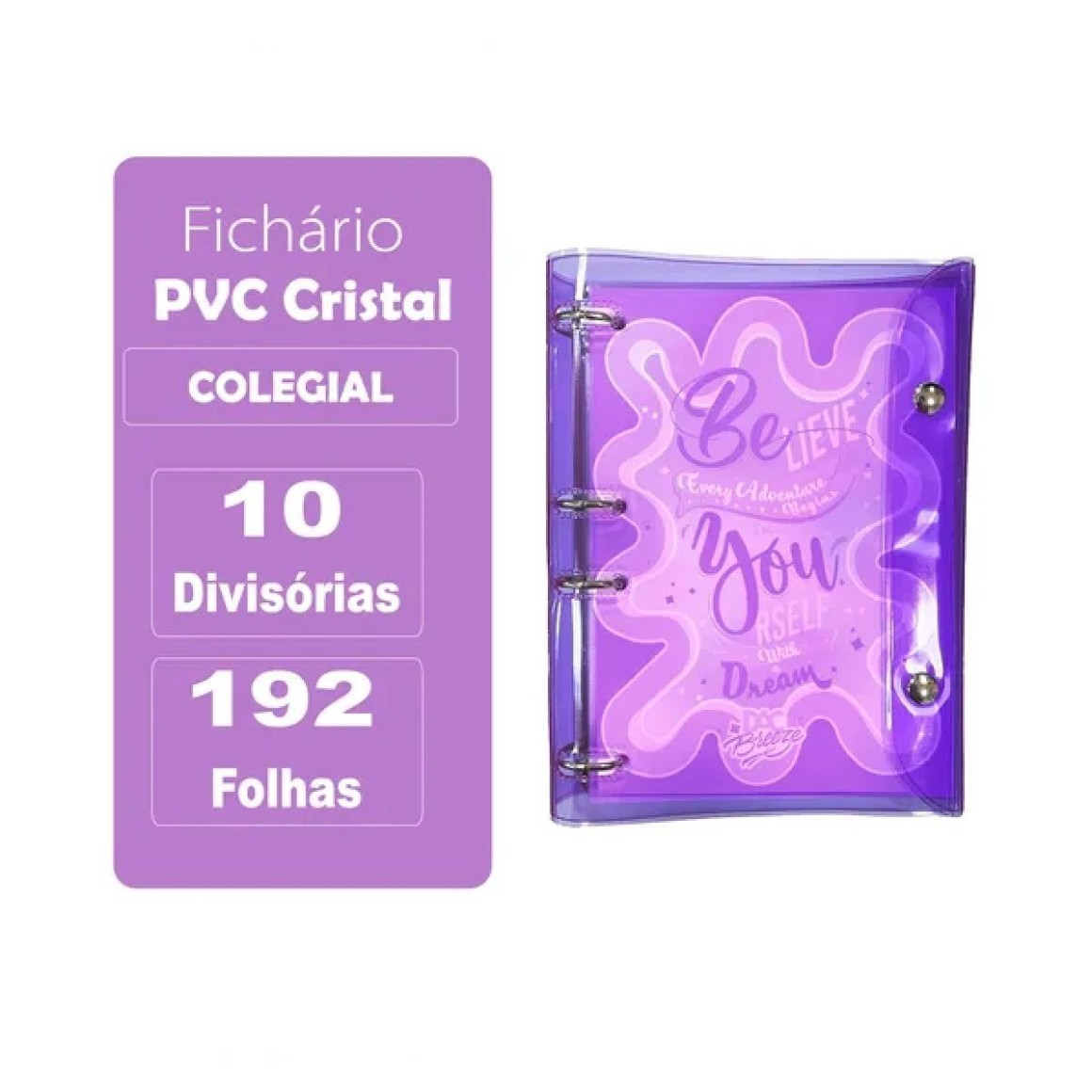 Detalhes: Feito em PVC Cristal, 192 Folhas decoradas de gramatura 56g cada, 10 divisórias e fechamento em botão