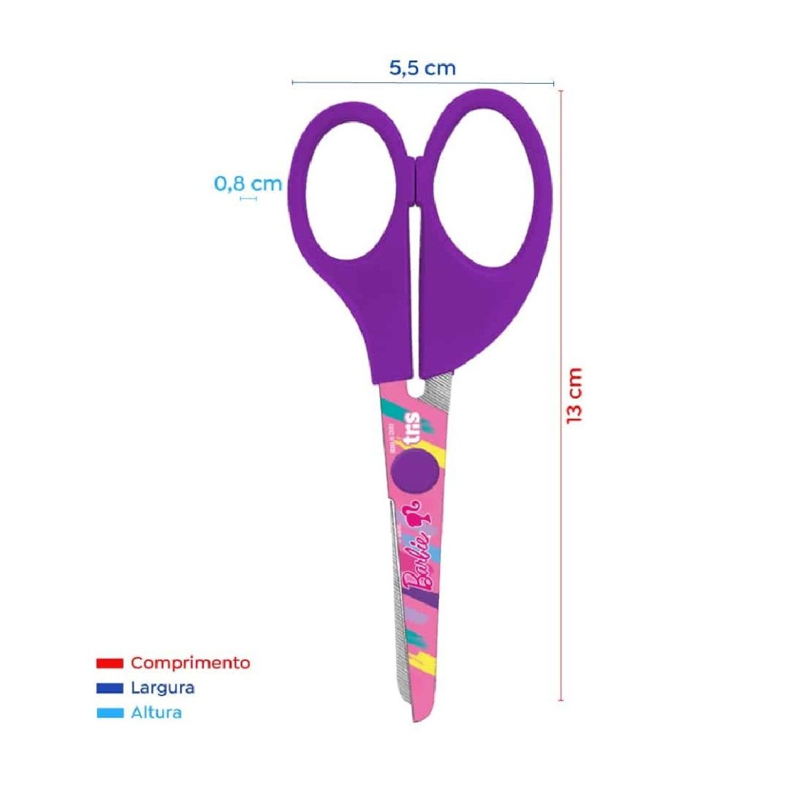Com pontas arredondadas e cabo resistente em PP, a tesoura Barbie possui as lâminas decoradas, 13cm de comprimento total e 1,5mm de espessura de lâmina. É em aço inox, com cabo na cor rosa!