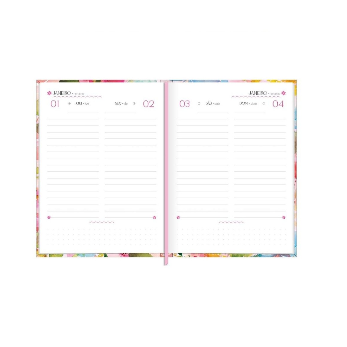 A Agenda Costurada Diária 12,3 x 16,6 cm Feminine tem capa dura, costurada, com visão permanente de 2 dias por página. Ideal para a organização do dia a dia.